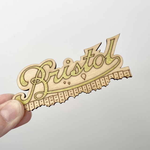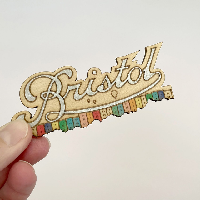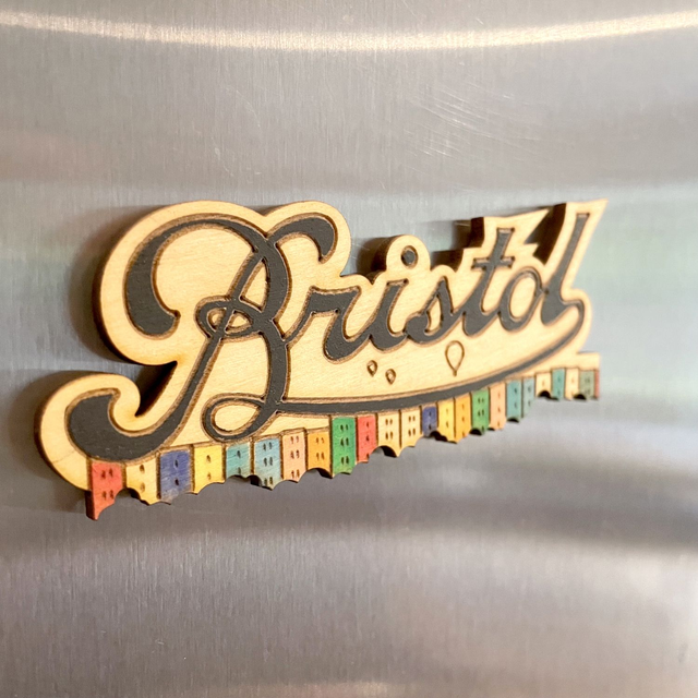 Bristol logo magnet made from 3mm FSC plywood, the illustrated houses and balloons have been laser cut and etched. Each magnet is hand-painted, with lots of options available. Colour of houses vary. Please get in touch if you require something specific! Choose large letter postage, or free local collection if near to Downend, Bristol, UK.