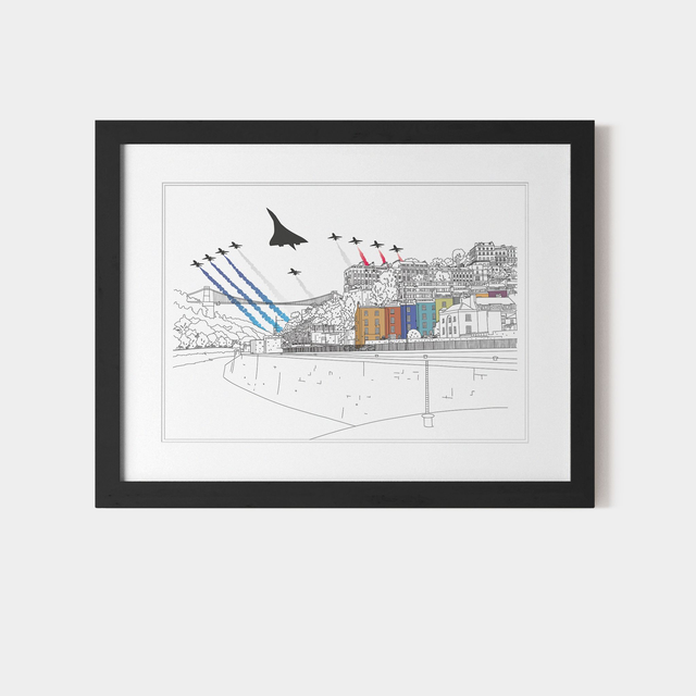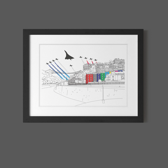 Digitally illustrated & coloured - meticulously hand-drawn using an iPad pen and iPad. Planes have been laser cut and individually placed onto a quality print by hand. A4 or A3 and two colour choices for the houses: 'Brights' vibrant primary colours or
