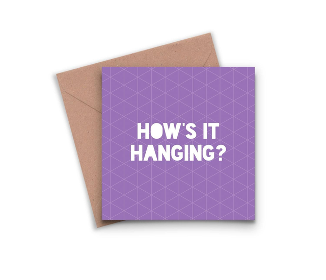 How's it hanging? Brightly coloured card for many occasions - just checking in on somebody who's been unwell. Left blank inside for your own message. Size: 140x140mm Main colour: Purple Envelope: White FSC certified 350gms board.