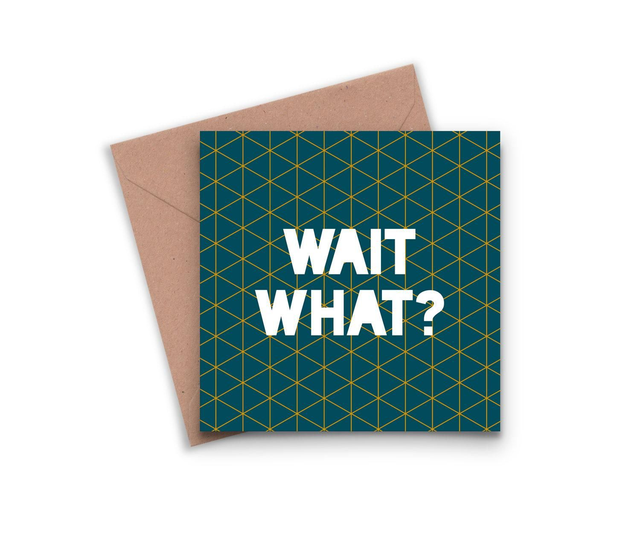 Teenage talk. Translates "excuse me?" "really?" "are you sure?" Left blank inside for your own message. Size: 140x140mm Main colour: Blue Envelope: White FSC certified 350gms board.